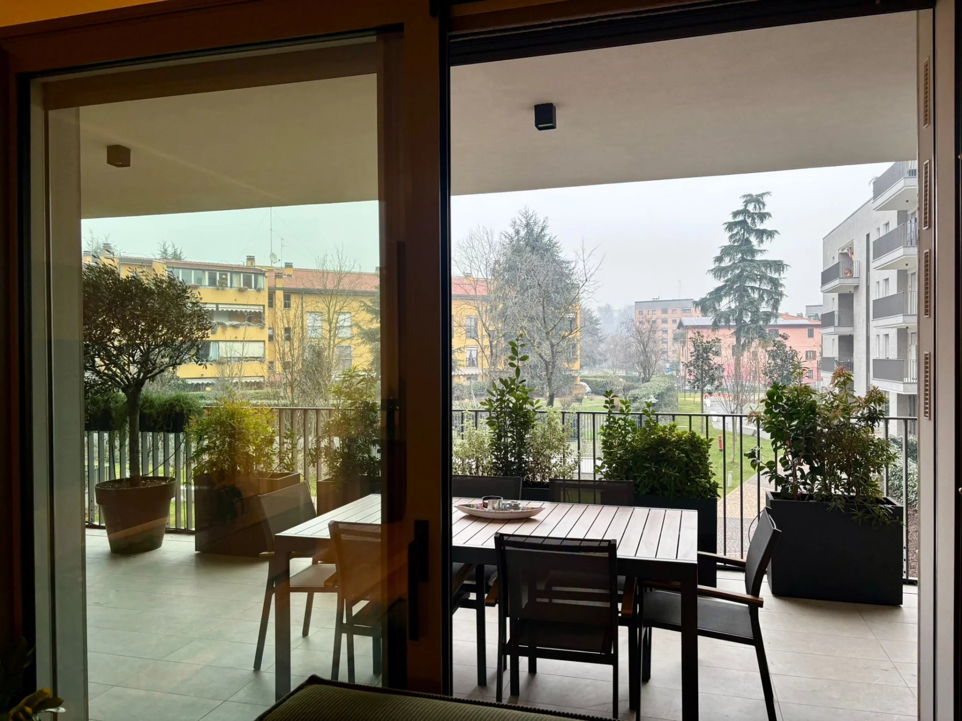 Terrazzo al piano di 37 mq sul giardino condominiale. La posizione dell' unità è particolarmente vantaggiosa, la vista aperta verso il lato lungo del grande giardino, che dona luce ed insieme riservatezza all' unità.